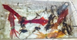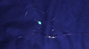 Dal dacron con un altro uni-to-uni giunto uno spezzone di fluorocarbon del 30/35 che può variare dai 5 ai 15 mt, a seconda dell’attività e della diffidenza dei cefalopodi, a questo punto inserisco un ammortizzatore fatto con 15 cm di elastico da roubasienne pieno, di diametro 2, con due girelle alle estremità, questo servirà per evitare che, pompando, i nostri delicatissimi cefalopodi si strappino, da qui parto con il terminale vero e proprio, un trenino di artificiali fissati con delle apposite girelle a T con un braccetto metallico.