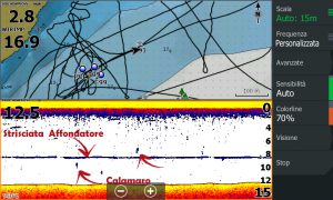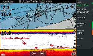 Va da se che in una pesca di ricerca come questa, la strumentazione di bordo è molto importante, uno strumento potente ed affidabile è quasi indispensabile, vi consiglio di utilizzare una doppia frequenza per vedere bene alle alte frequenze le marcature dei cefalopodi e alle basse frequenze, con un cono più ampio, dove sono i nostri affondatori e, se le nostre esche passeranno nelle marcature.